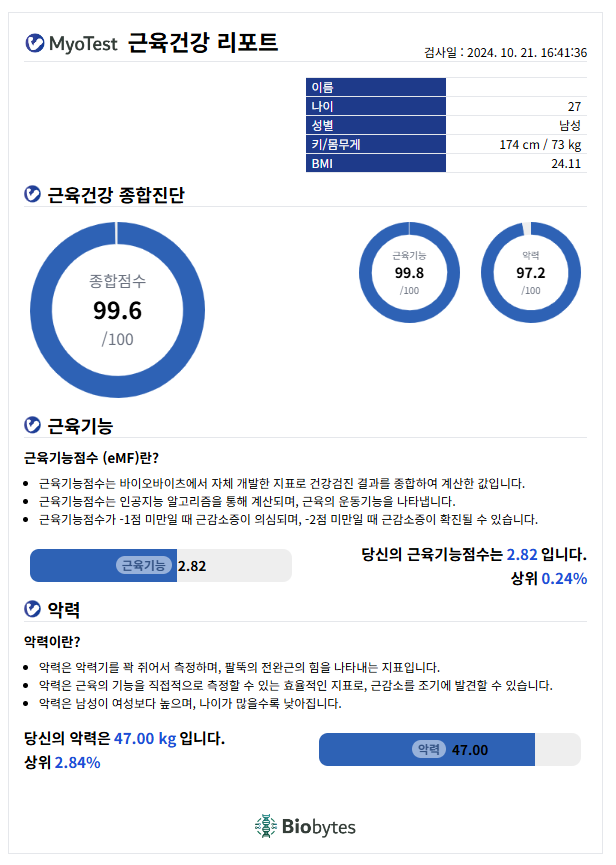바이오바이츠에서 개발한 근육기능성 지표 (eMF)를 사용하여 근육 건강을 평가합니다. 데이터는 자동저장되고 분석되어 추적관리할 수 있습니다.